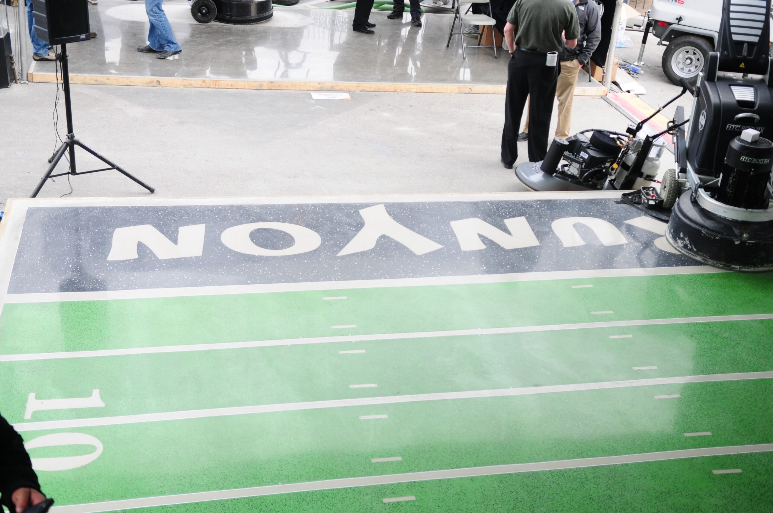 As mentioned, Floormap Stencil Designs did the Seahawks and Broncos stencils in the middle of our slab, and they did a fabulous job! Each stencil was three layers — making for an incredibly intricate pair of logo designs. Rachel Bruce is the artist who designed the custom stencils, and she was the one who actually applied them at World of Concrete.