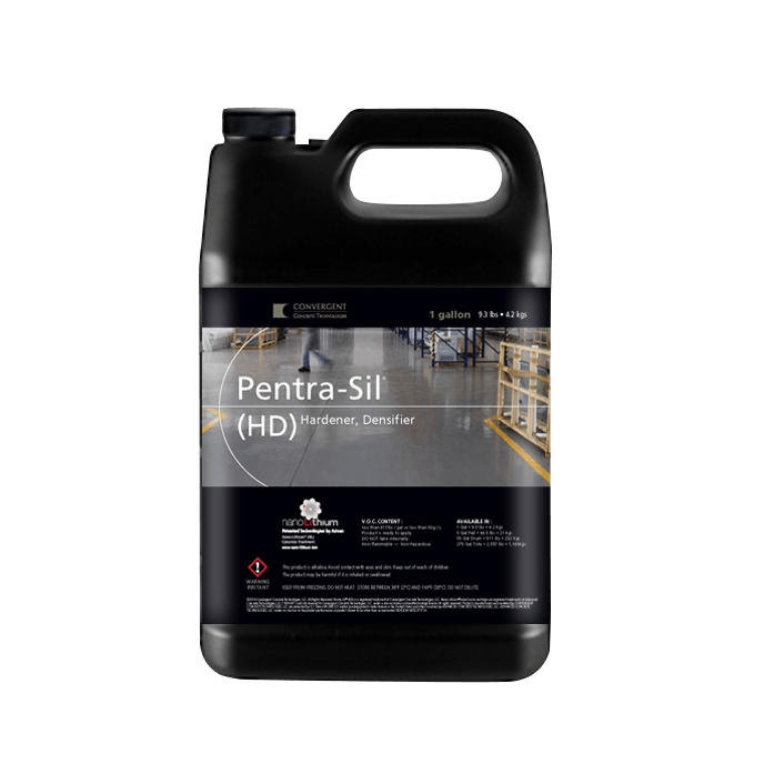 Pentra-Sil (HD) is a premium lithium polysilicate performance densifier for concrete surfaces. This high solids formula provides maximum hardening to improve abrasion resistance and reduce dusting. This easy-to-use water-based solution requires no rinsing and is VOC compliant in all areas of the world. When sprayed on new or existing concrete, it penetrates up to 1/4 inch (7mm) where it reacts with free calcium to form insoluble calcium silica hydrate, which makes concrete more water, stain, and abrasion resistant for easier maintenance and longer life. It is also suitable for concrete polishing procedures and helps prolong the life of polished finishes.