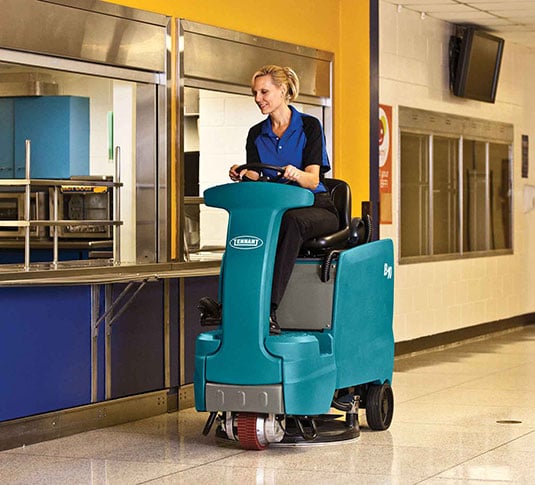 - Make tight turns and access elevators easily with the Tennant B10 battery ride-on burnisher’s compact size.