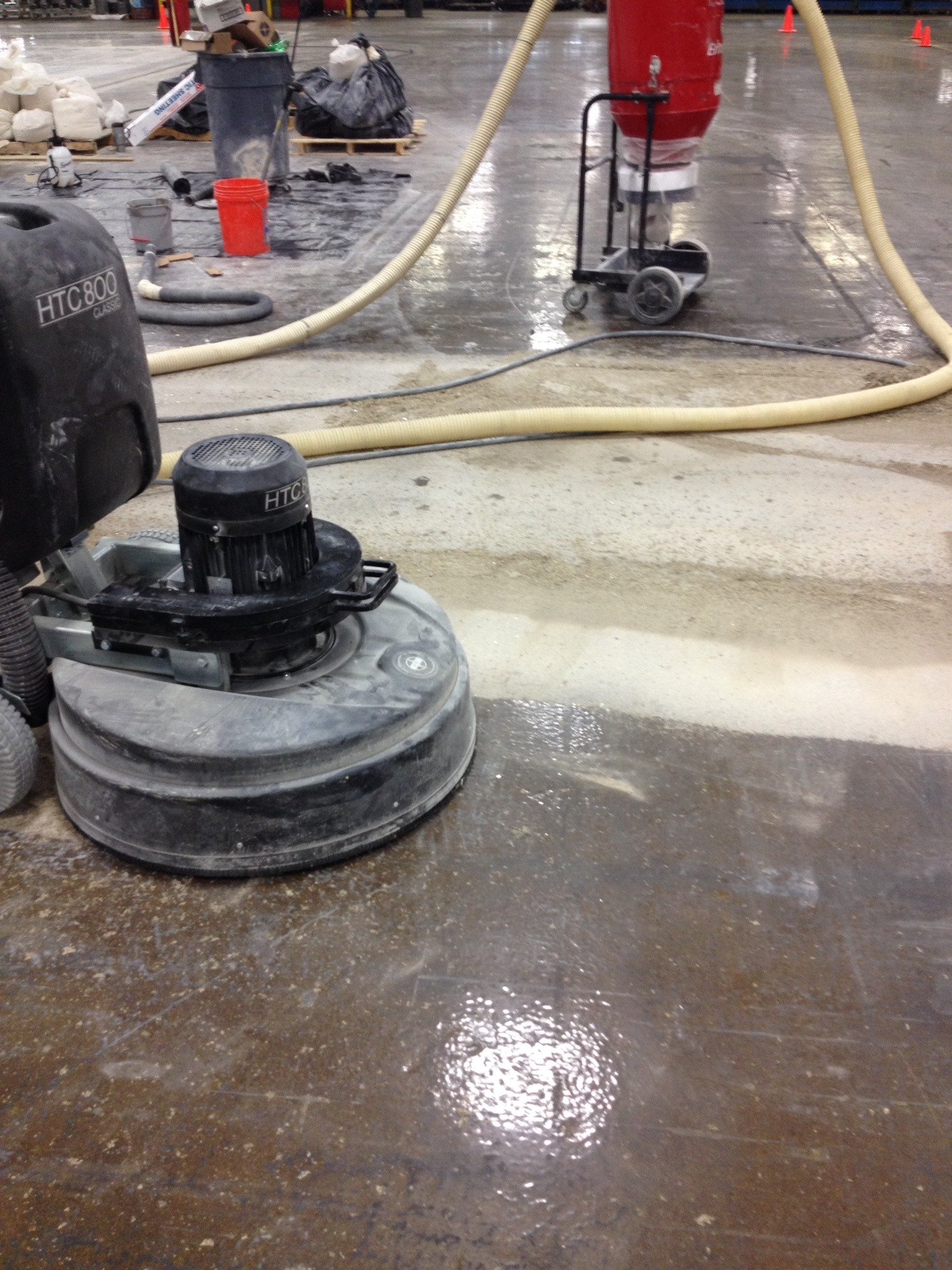 2. Exposing Aggregate: The second demo was by Applied Flooring, who did a 10′ x 10′ patch in their shop on an already polished floor. The goal was to expose large aggregate with an HTC 800 Classic and the Ravager. The Applied crew tested at various speeds (1, 5 and 10), and determined that the higher the speed, the more quickly this tool tore up the concrete. With that said, the Ravager effectively took the slab to the desired aggregate after two passes. One thing to note for anyone wanting to use the Ravager on an 800 Classic though, is that the tool makes the machine stand up tall, so you may need to adjust your shroud so as not to have a gap that allows dust and dirt to fly up. See images from this demo below.