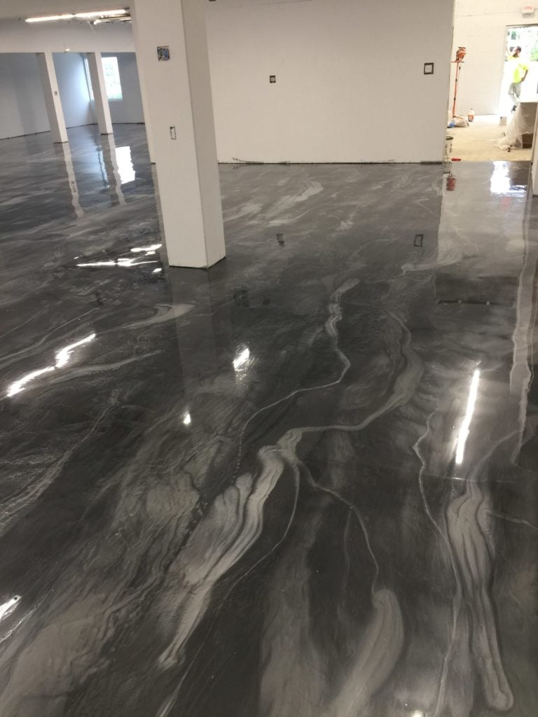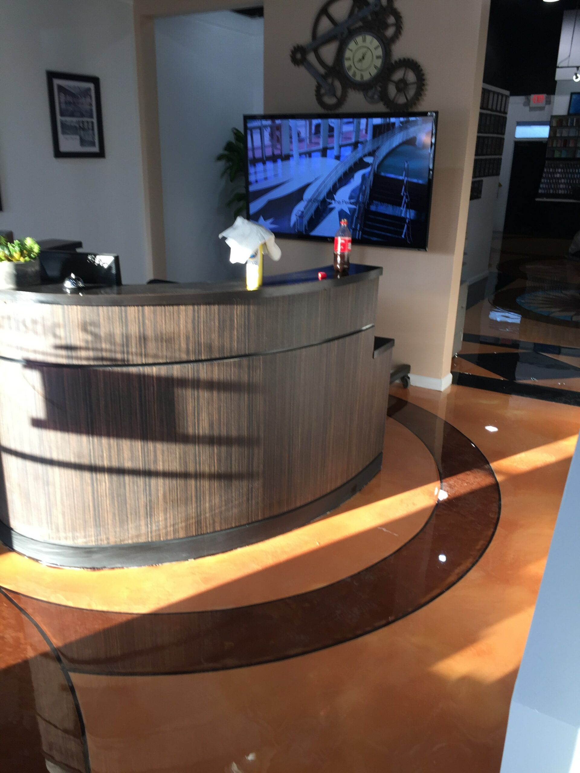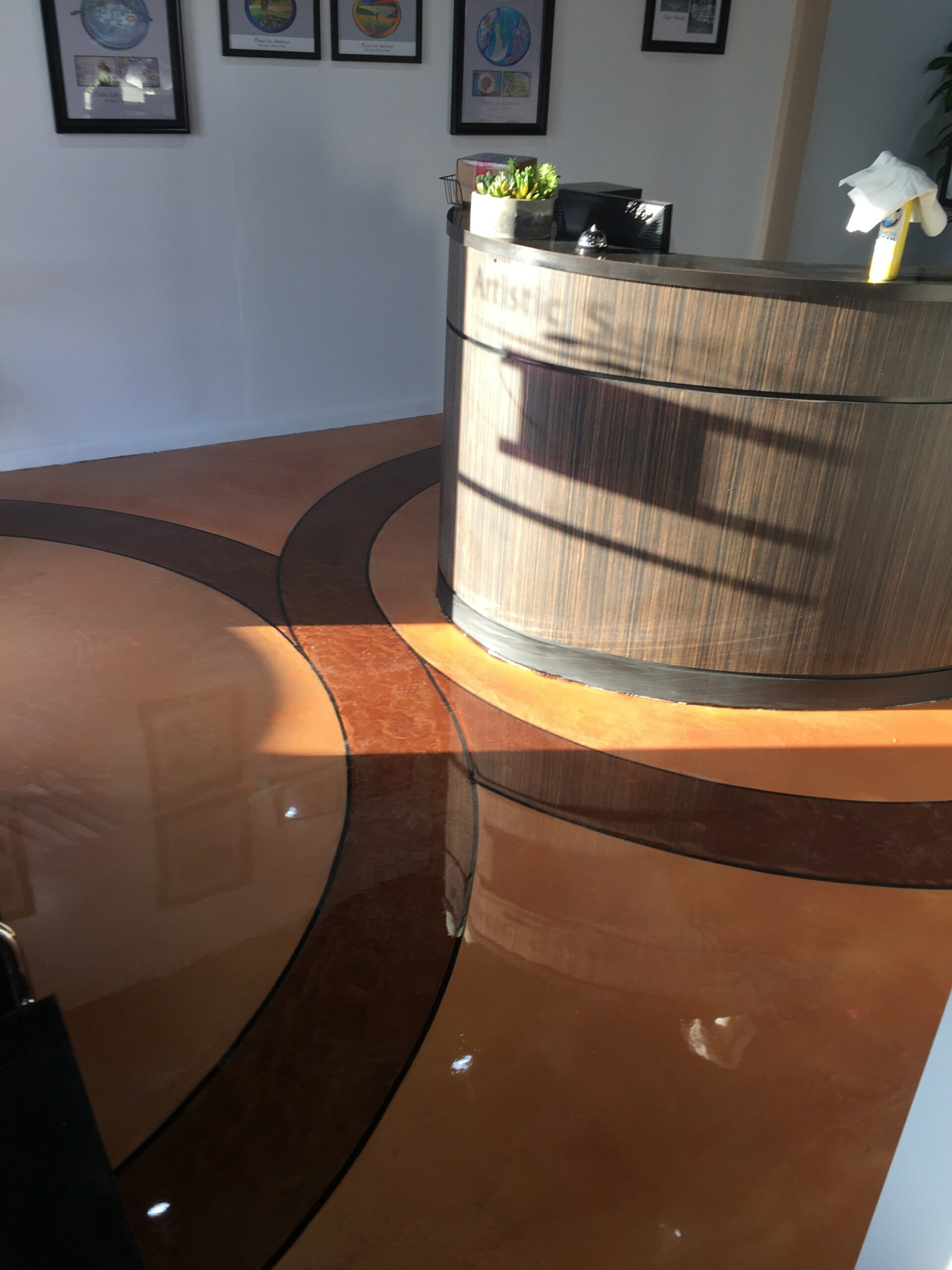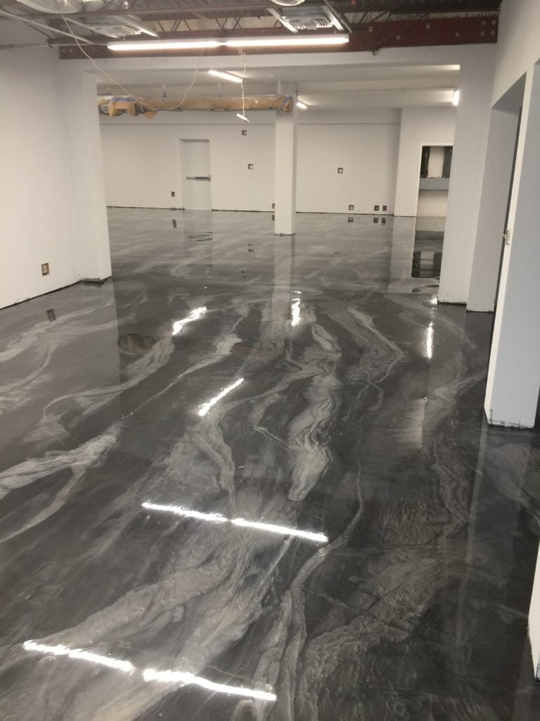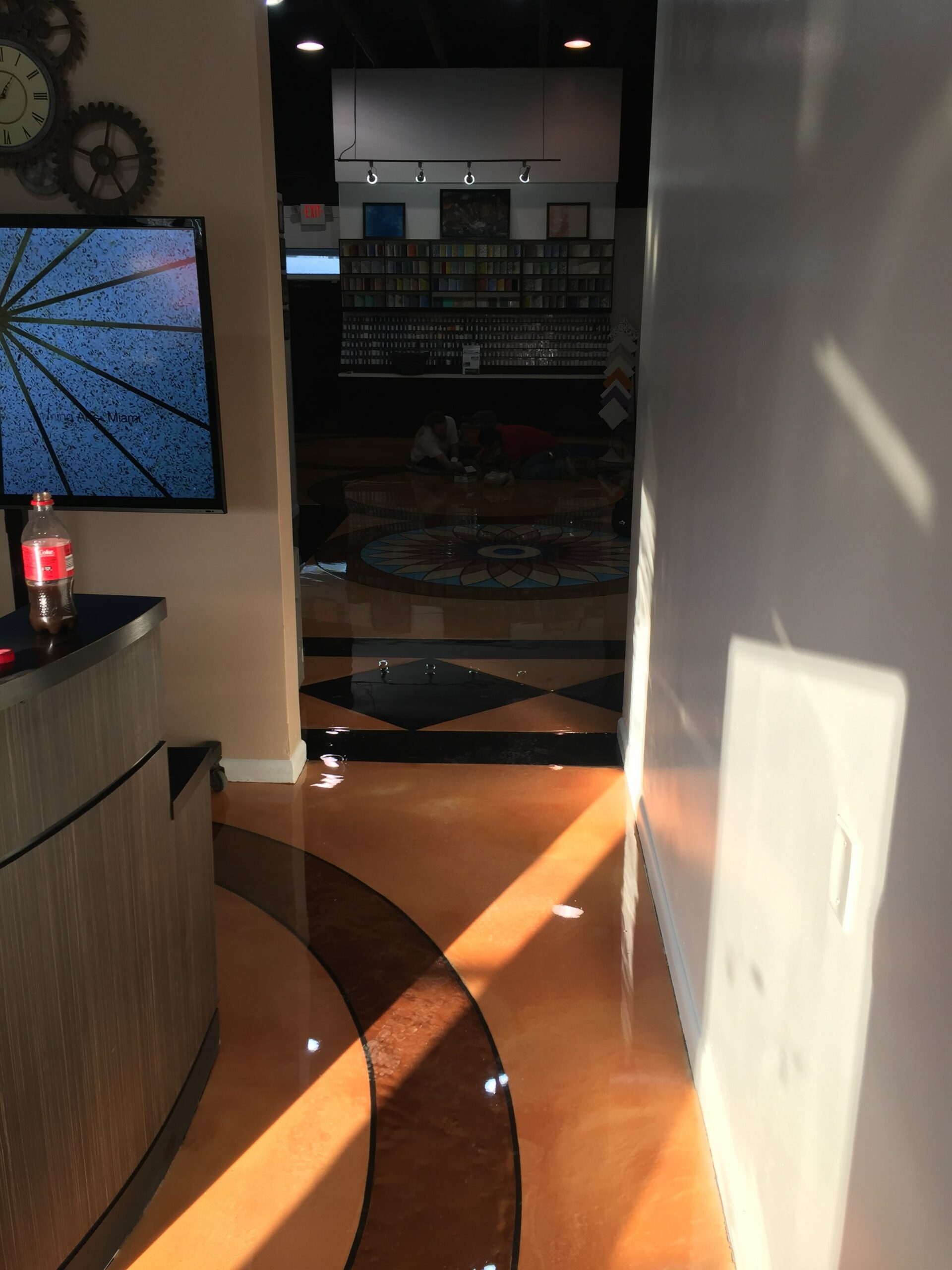 Artistic recently re-did their 1,300 square foot office floor. They cut off the old white overlay and transitioned it to an epoxy metallic floor. They kept the same detailed saw-cut design work.