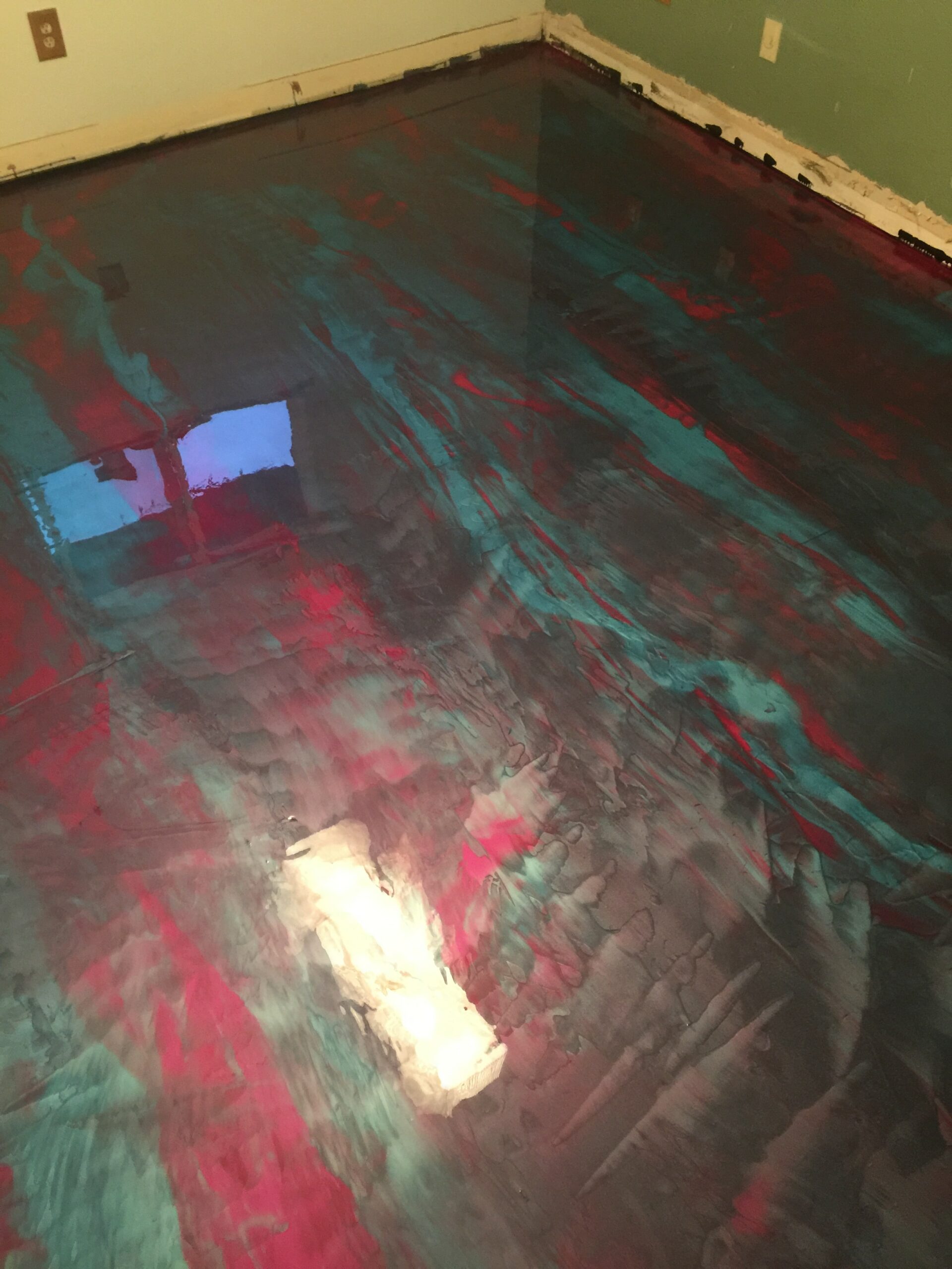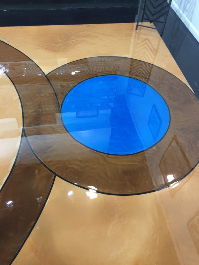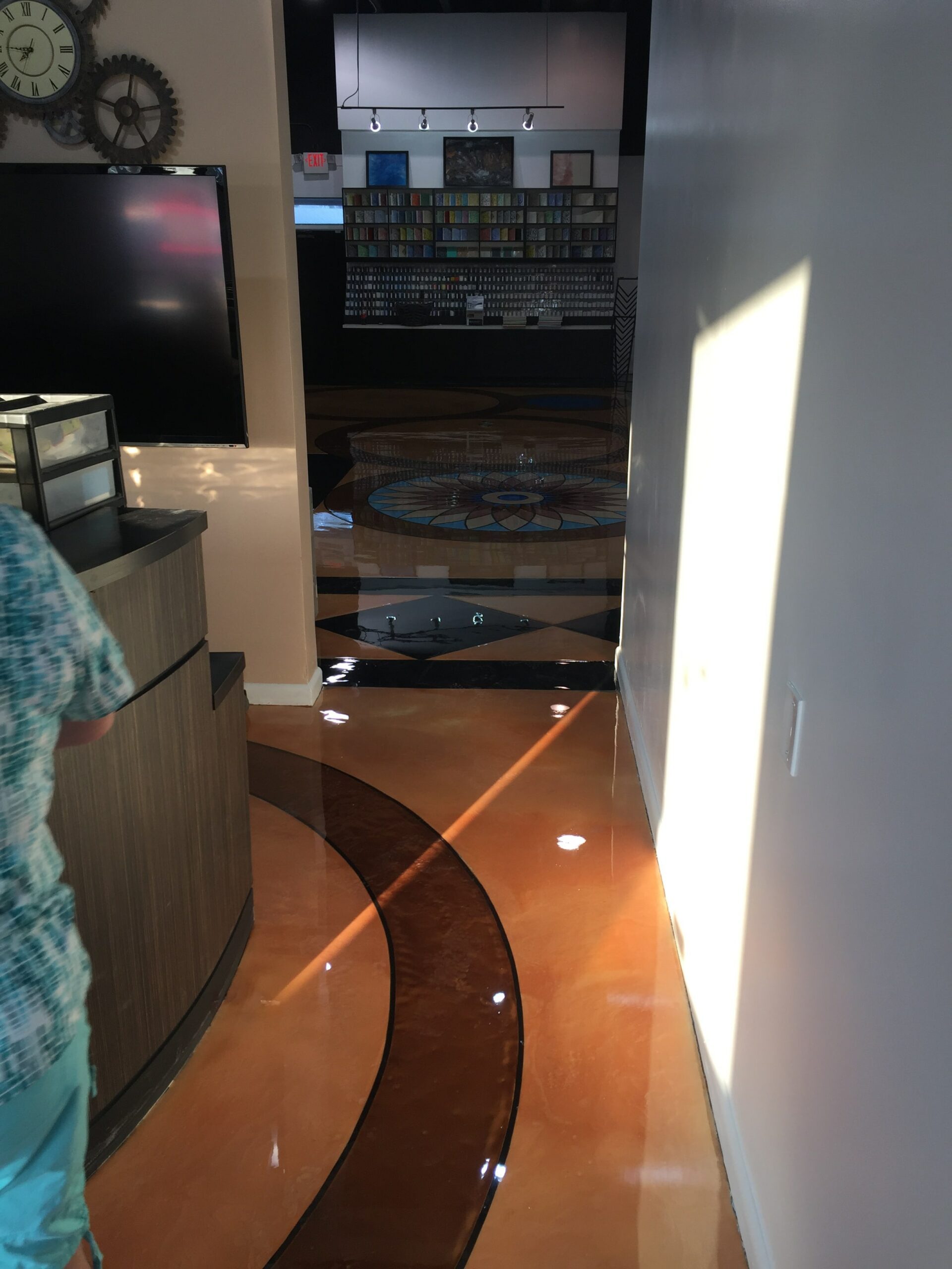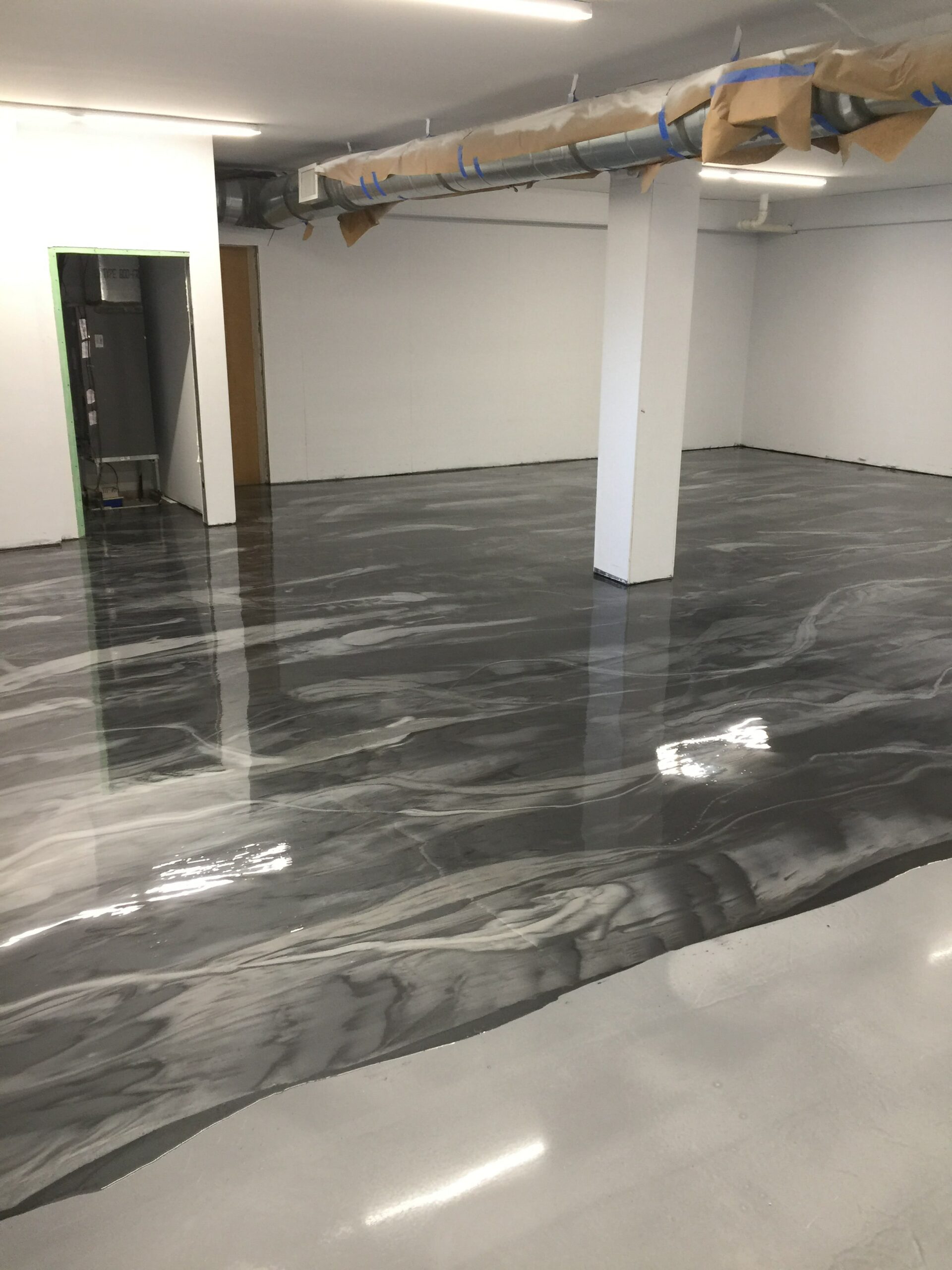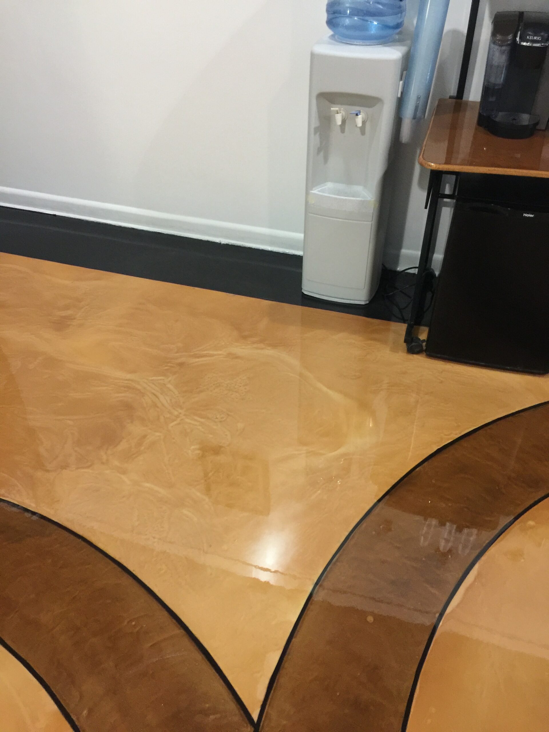 Artistic recently re-did their 1,300 square foot office floor. They cut off the old white overlay and transitioned it to an epoxy metallic floor. They kept the same detailed saw-cut design work.