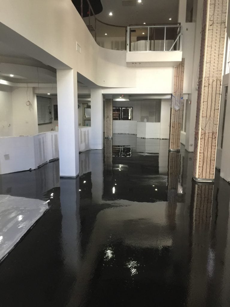 An HTC 800 and 25 grit diamonds were used to prep the surface. Artistic also used CTS Rapid Set TRU self-leveling overlay in the back of the bar. The black portion of the epoxy floor was pigmented with Jet Black metallic and the stripes were pigmented with Aluminum metallic.