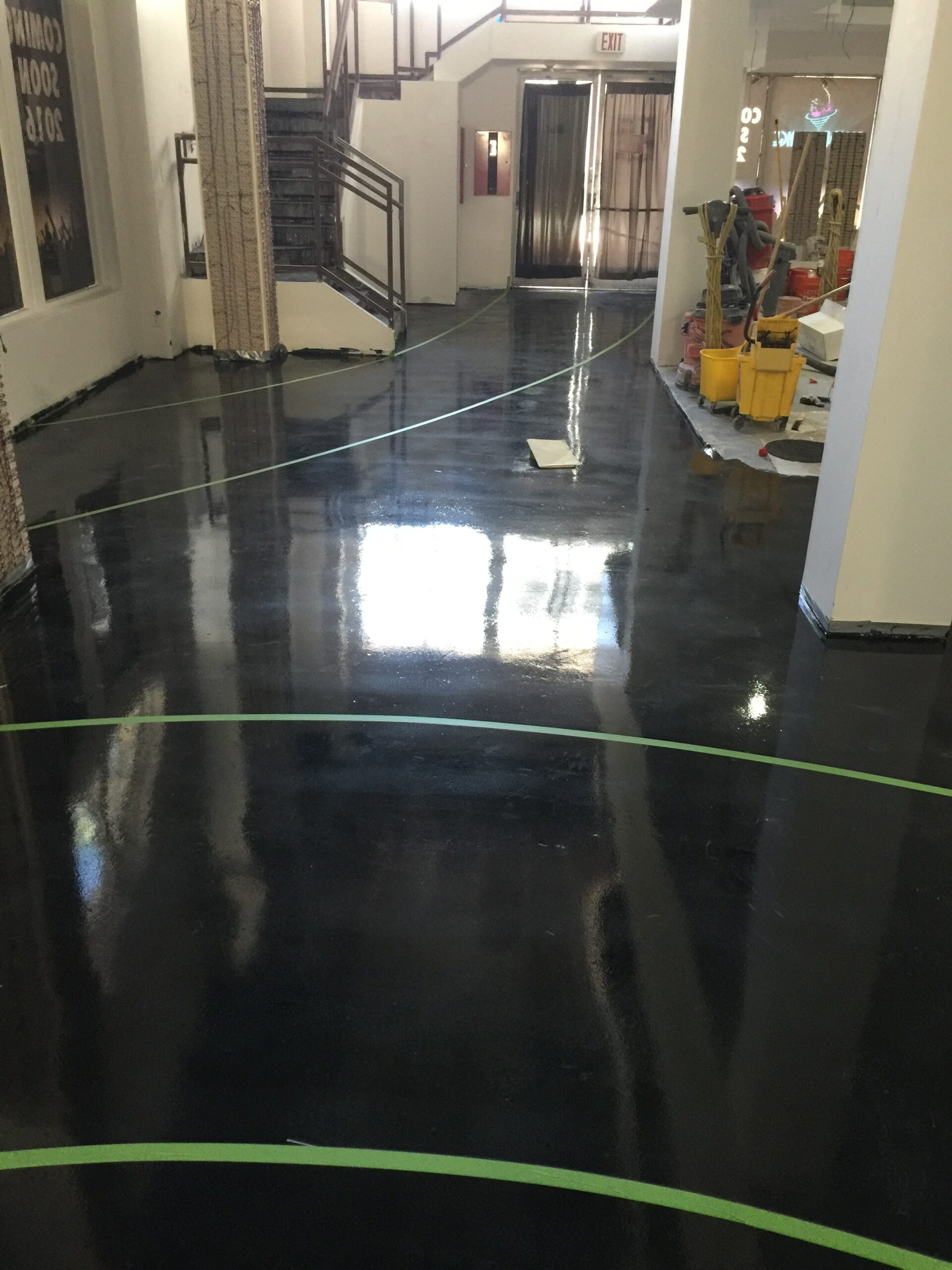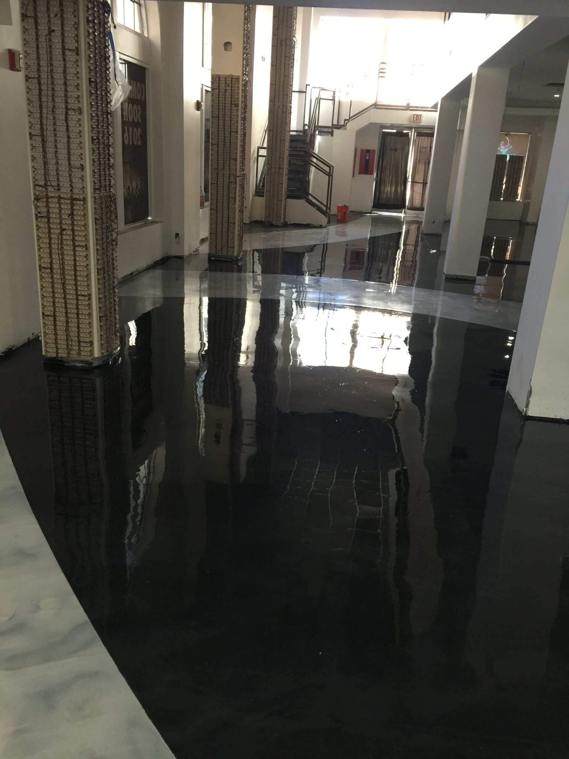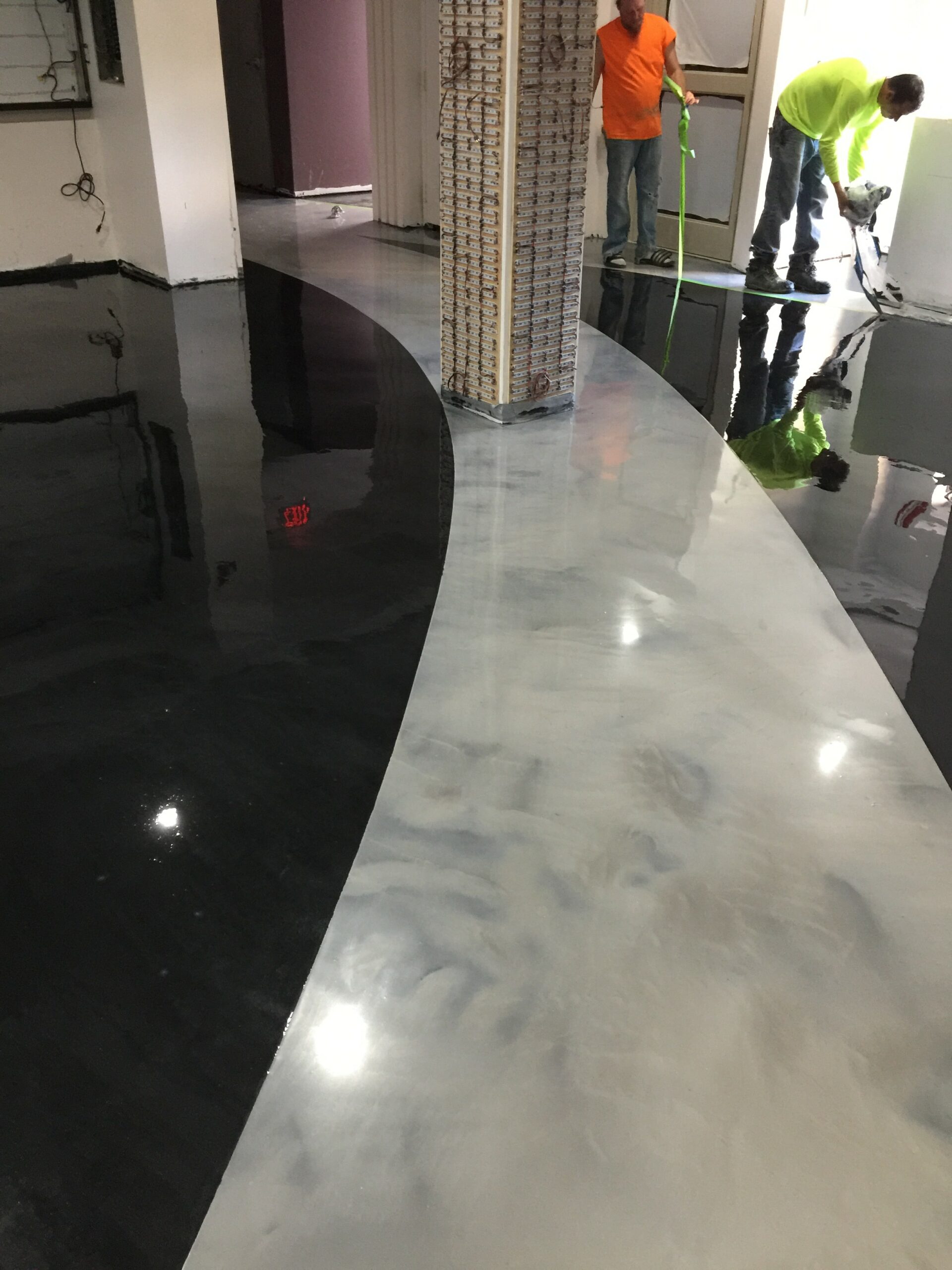 This black and aluminum striped floor is located in a 5,500 square foot bar called the Escape Lounge. The epoxy was poured with a black base and then the aisles were taped out in a curved design and colored with Aluminum metallic.