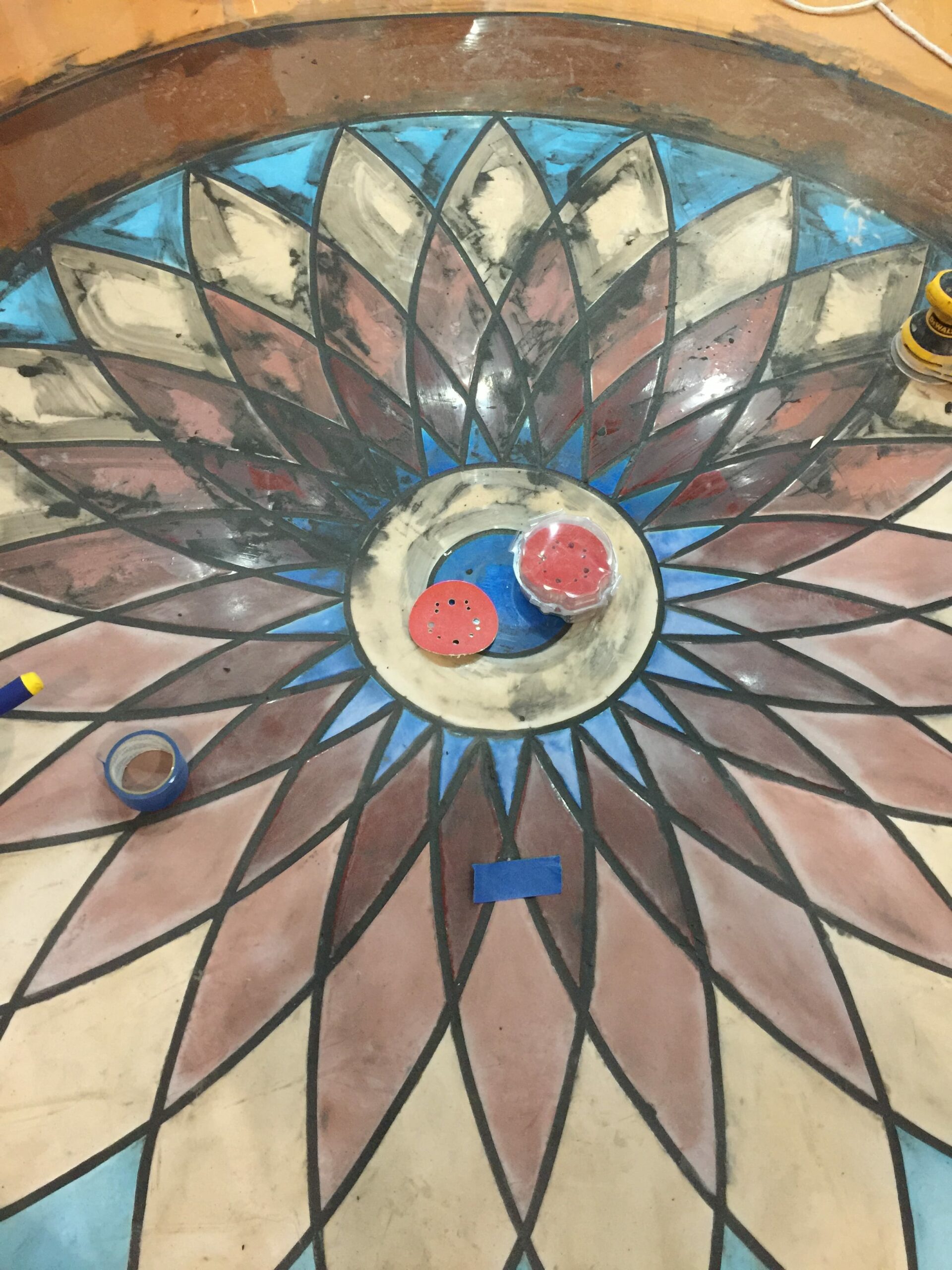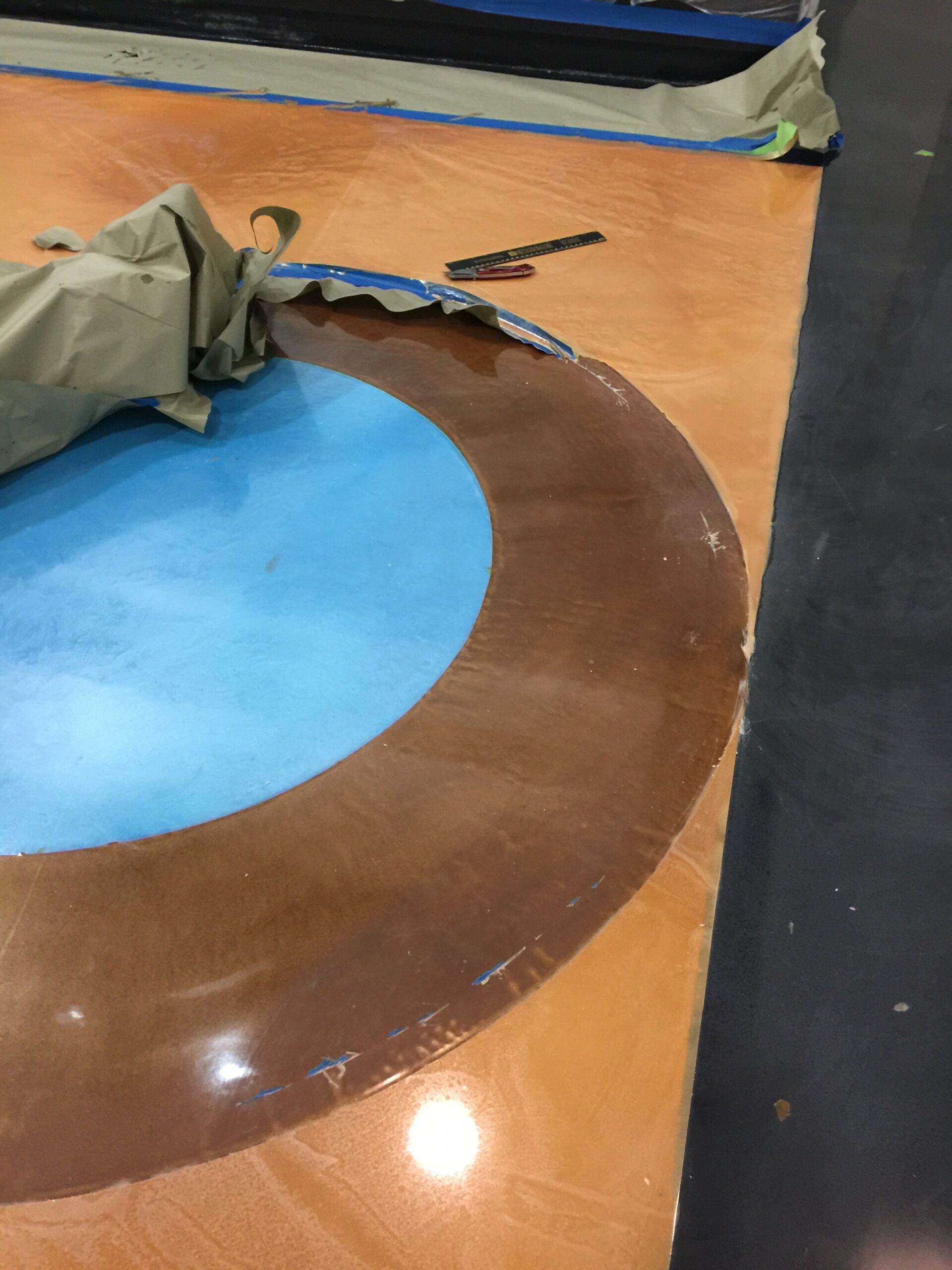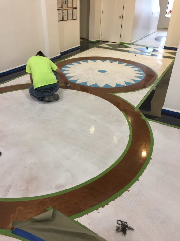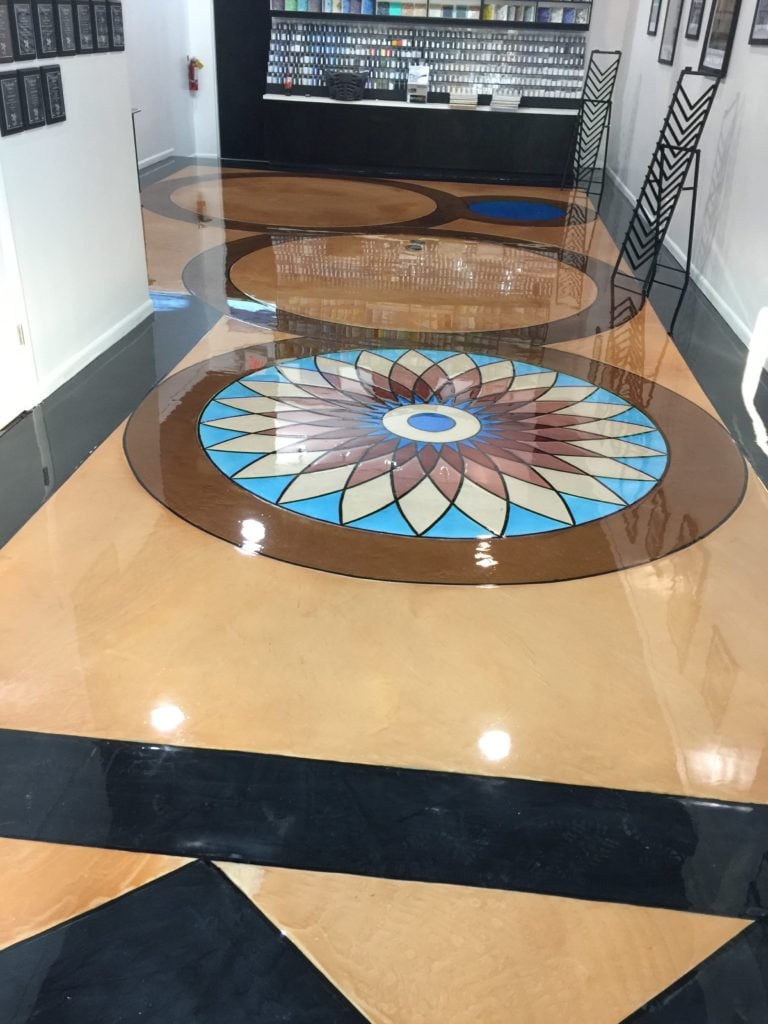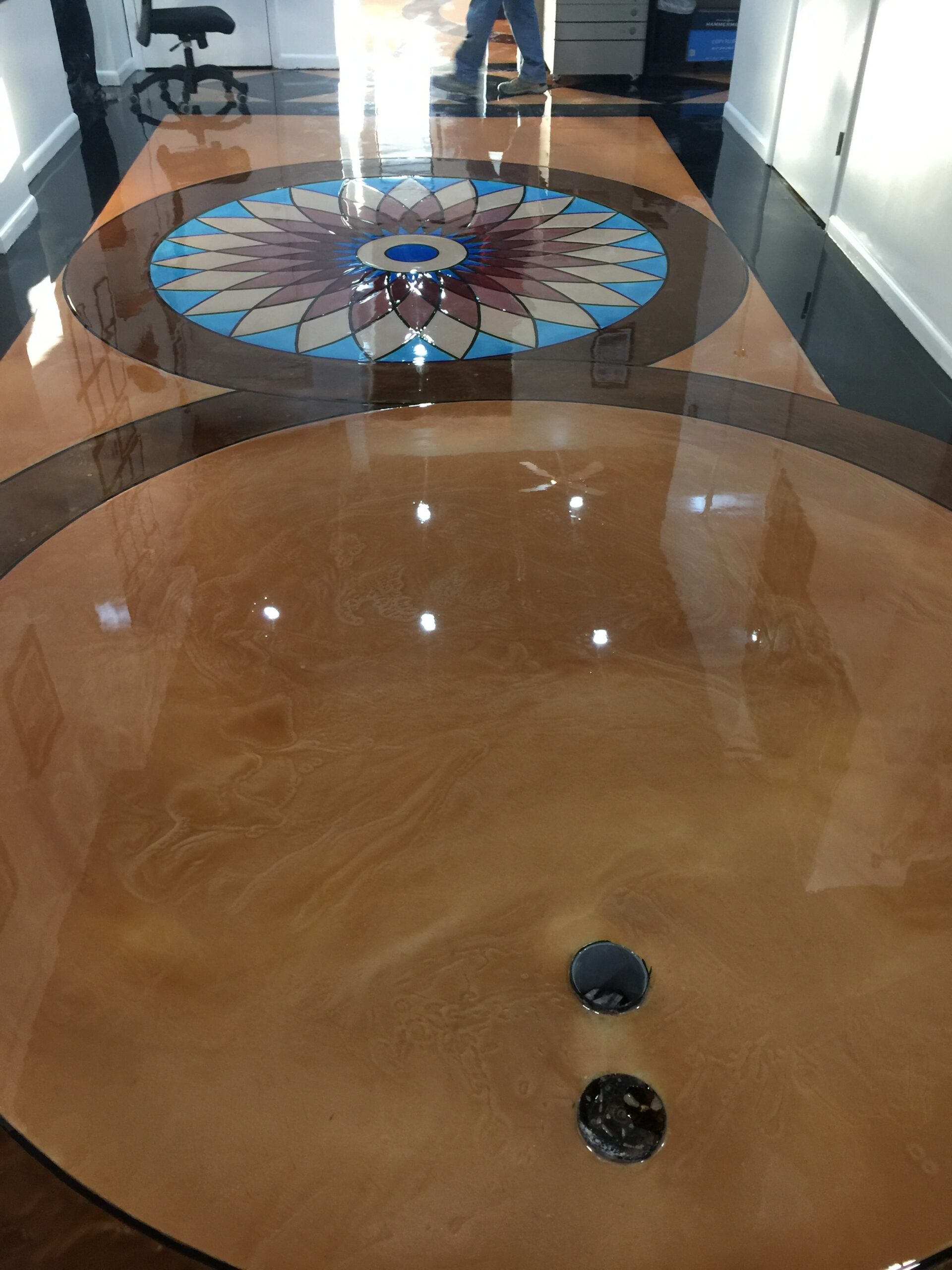 To prep the surface, Artistic used a 60 grit screen and floor buffer. This epoxy floor required a myriad of metallic pigment colors for all the intricate designs: Copper, Butterscotch, Merlot, Mother-of-Pearl, Surfs Up, Rose, Maui and Jet Black.