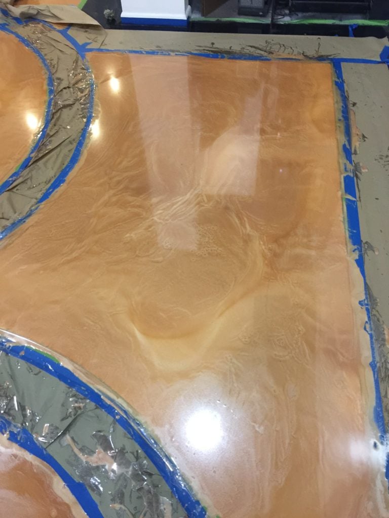 They prepped the surface with an HTC 500 and 25 grit HTC diamonds. It’s an epoxy with black pigment base and metallic pigment colors Surfs Up and Merlot.